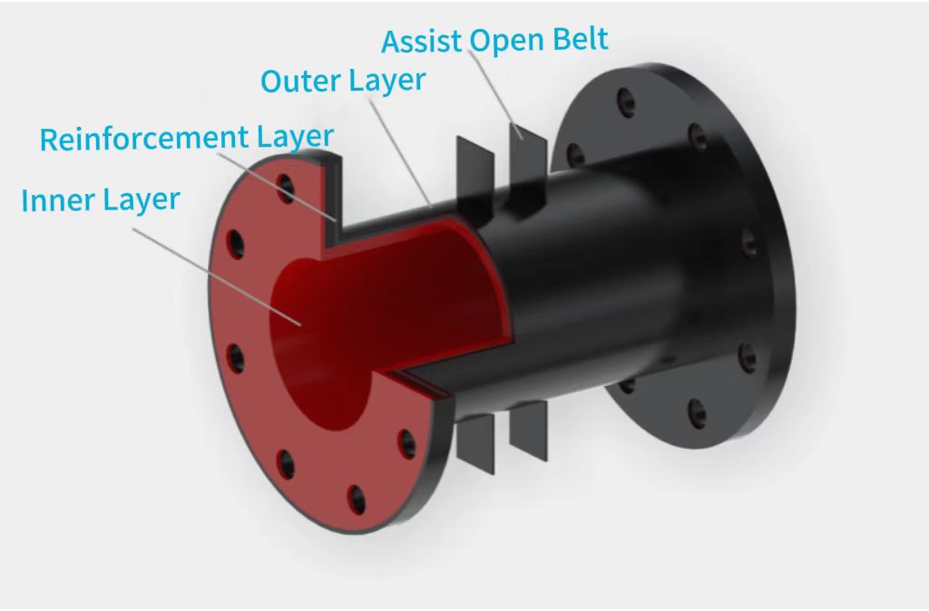- Binnenlaag: speciaal ontwikkeld voor veeleisende omstandigheden zoals slijtage, corrosie en hoge temperaturen, dient het als frontlinieverdediging tegen het medium.