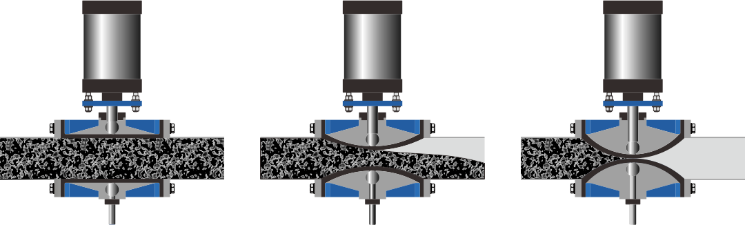 Sluiten: Het aandrijfmechanisme (handmatig, pneumatisch of elektrisch) duwt twee klemstangen, waardoor de veerkrachtige huls nauwkeurig langs de middellijn wordt samengedrukt om een luchtdichte afdichting te bereiken. Zelfs als er vaste deeltjes in het medium aanwezig zijn, zijn deze goed omsloten en geblokkeerd.